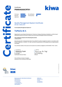 TeMeCo supplies high-quality and innovative medical devices for cardio-diagnostic examinations at the patient’s home. Patient safety is essential. The starting point for TeMeCo is that its solutions meet the legal requirements and guidelines. Therefore, the quality management system of TeMeCo is certified against the ISO 13485:2016. This means that the quality management system is appropriate and effective while emphasizing the safety and efficacy of medical devices.